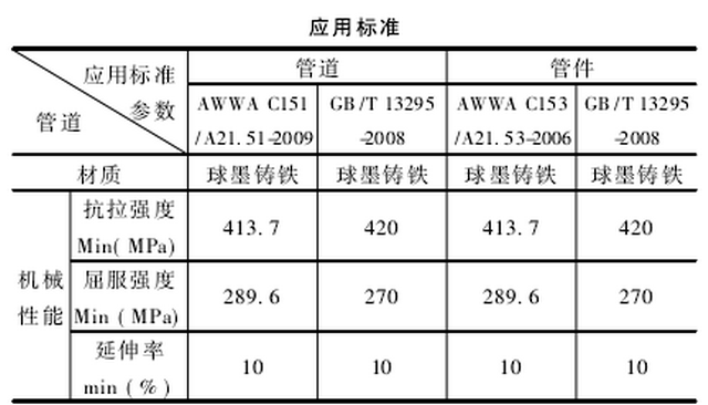 通過對(duì)中美兩國(guó)標(biāo)準(zhǔn)的分析,認(rèn)為按國(guó)內(nèi)GB/T 13295-2008 標(biāo)準(zhǔn)生產(chǎn)的鑄鐵管道及管件能滿足 AWWA C151/A21.51-2009 Ductile-Iron Pipe, Centrifugally Cast 球墨鑄鐵管道和 AWWA C153/A21.53-2006 Ductile-iron Compact Fittings for Water Service 球墨鑄鐵管件的性能要求。